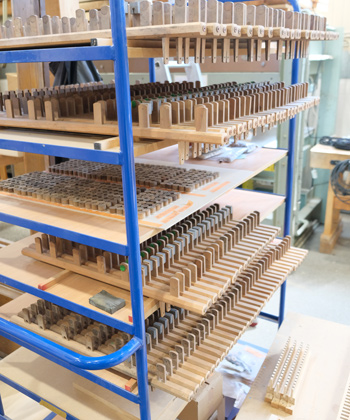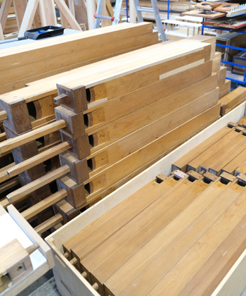 Die Holzpfeifen warten fertig bearbeitet auf den Rücktransport
