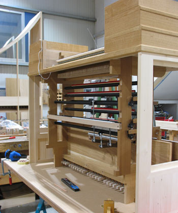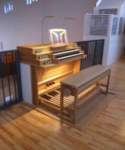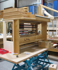 Der Spieltisch steht zentral mittig auf der Empore, die Manuale werden zu beiden Seiten rein mechanisch bedient.