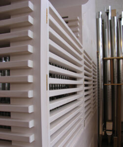 Das Pedal steht auf zwei unterschiedlichen Plätzen, hinter dem Hauptwerk verdeckt und wird rein elektrisch bedient.