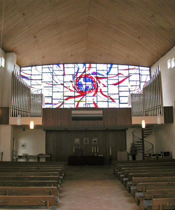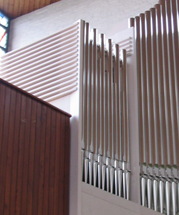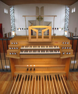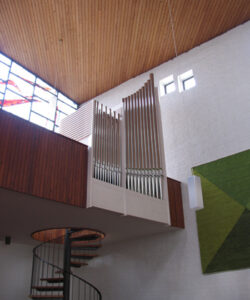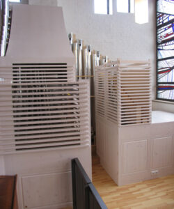 Die beiden seitlich sichtbaren Orgelteile stellen das Hauptwerk und Positiv. Die Gestaltung nimmt Bezug auf die Bauzeit der 1960-Jahre.