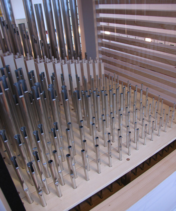Die beiden Manualseiten sind nach hinten mit Gitterwerken durchbrochen und schaffen bei Durchschreiten des Raumes durch Pfeifen und Streben eine lebendige Art Moiré-Effekt. Das prägende Fenster wird nun von den Orgelteilen eingerahmt, ist aber auch durch den Prospekt erkennbar.