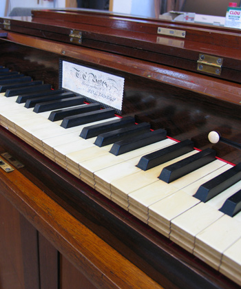 Als Vorläufer des Harmoniums wurde dieses Instrument 1841 gebaut. Ungewöhnlich ist die Ergänzung eines Pedals.