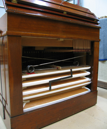Anders als beim späteren Druckwindharmonium wird der Wind konstant aus einem Zweifachfaltenbalg-Magazin bezogen, über einen Tritt (rechts) - oder Handhebel zu schöpfbar.